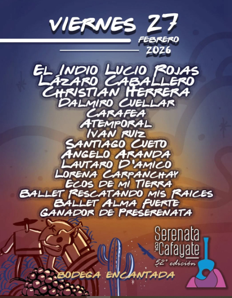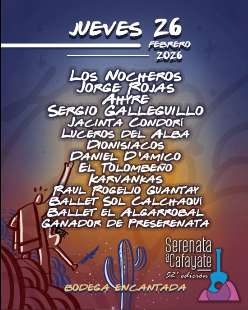 El histórico Festival de La Bodega Encantada ya tiene grilla confirmada. del jueves 26 al sábado 28 de febrero de 2026 miles de personas se reunirán en Cafayate para disfrutar del folklore y de los paisajes del norte. La cartelera, de figuras destacadas y artistas locales, promete una gran convocatoria