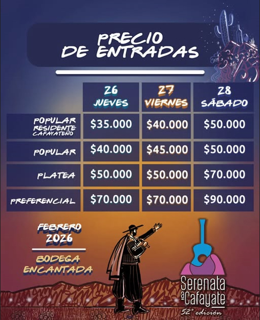 Entradas: Popular residente cafayateño: $40.000/ Popular: $45.000/ Platea: $50.000/ Preferencial: $70.000