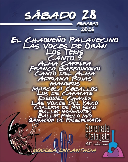 Sábado 28: gran cierre en la Bodega Encantada: Chaqueño Palavecino, Las Voces de Orán, Los Tekis, Canto 4, Alma Carpera, Franco Barrionuevo, Canto del Alma, Adriana Rojas, Mañeros, Marcela Ceballos, Los de Cafayate, Ezequiel Chávez, Las Voces del Yaco, Copleros de Río Seco, Ballet Horizontes, Ballet Pueblo Mío, Ganador de la Pre Serenata.