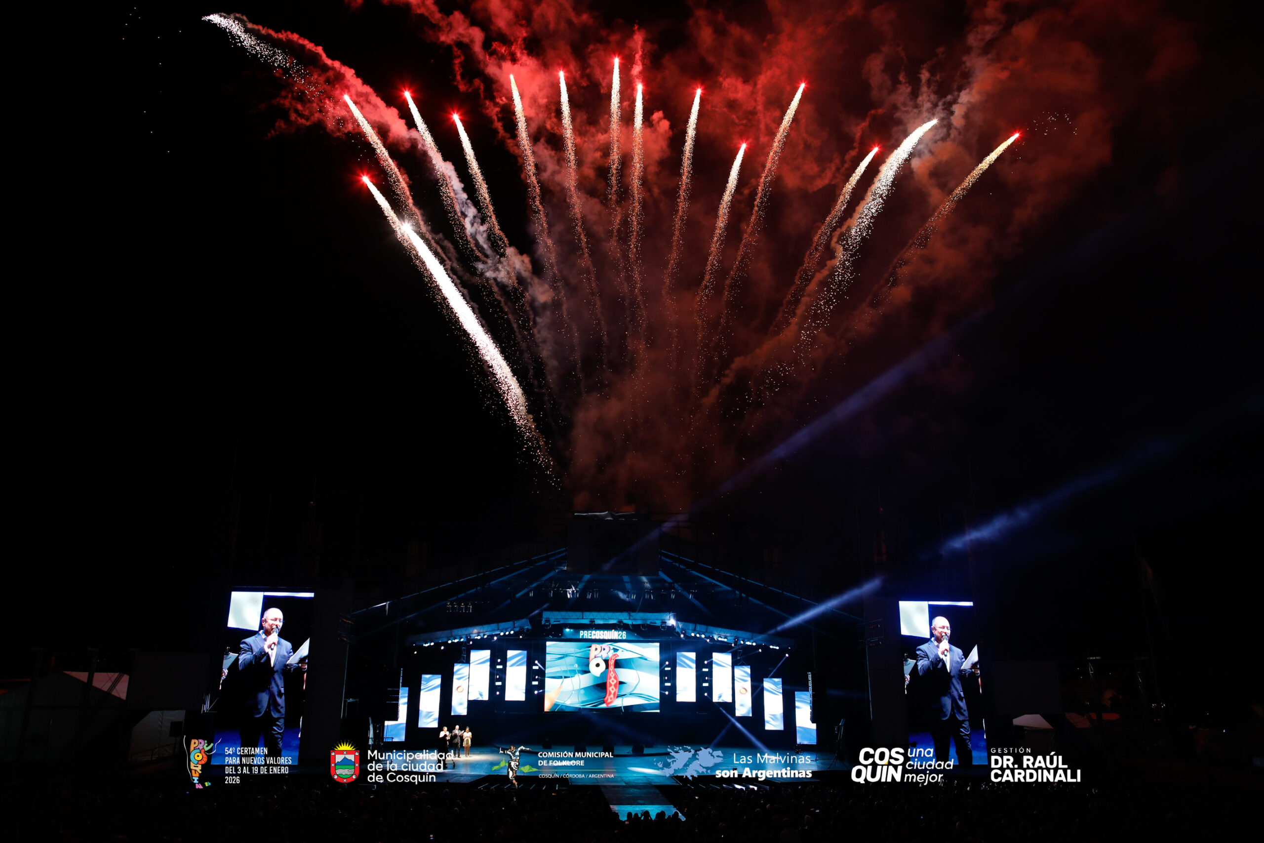 22 hs. Apertura oficial de la 66a edición del Festival Nacional de Folklore con la bendición del cura párroco Carlos Joaquín, el Himno Nacional Argentino y la presentación del Ballet de la Escuela Municipal de Folklore de Cosquín.